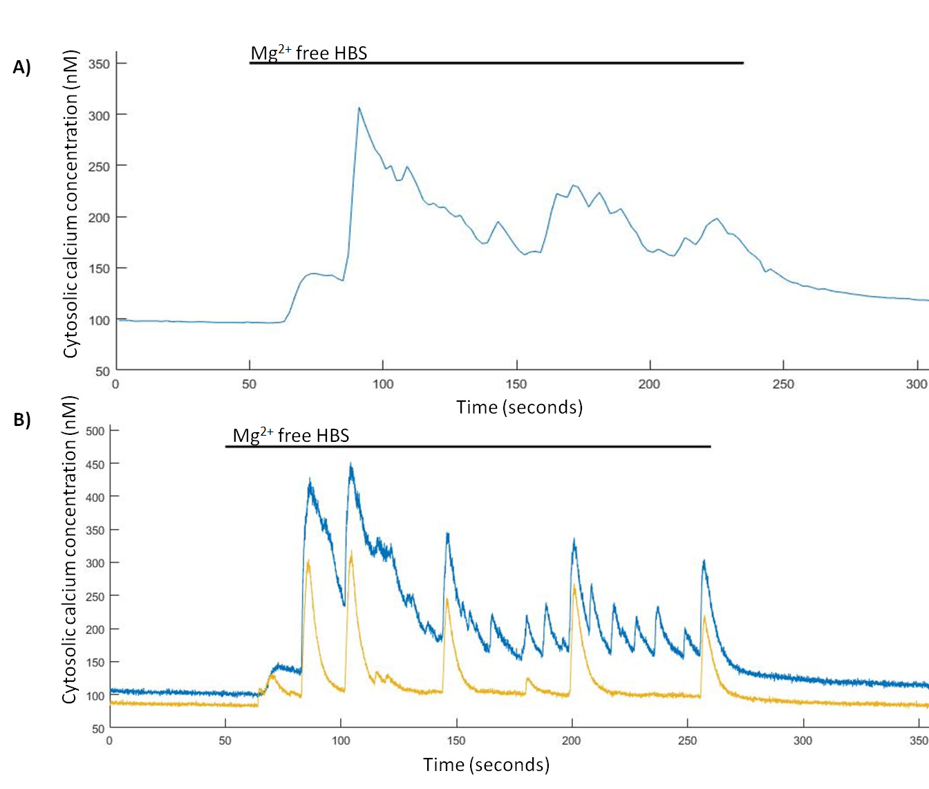 在不含Mg 2+的 HBS 中誘導自發Ca 2+事件。(A) 在0.5Hz下成像的無Mg 2+誘導的Ca 2+事件的單個海馬神經元的代表性跡線和(B)來自兩個無Mg 2+誘導的Ca 2+ 事件的兩個海馬神經元的代表性跡線,所述Ca 2+事件在24.39Hz 。